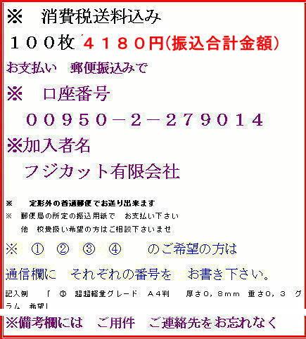 | 3 | 超超軽量グレード | A4(296×210mm) | 0.8 | 0.32g | |