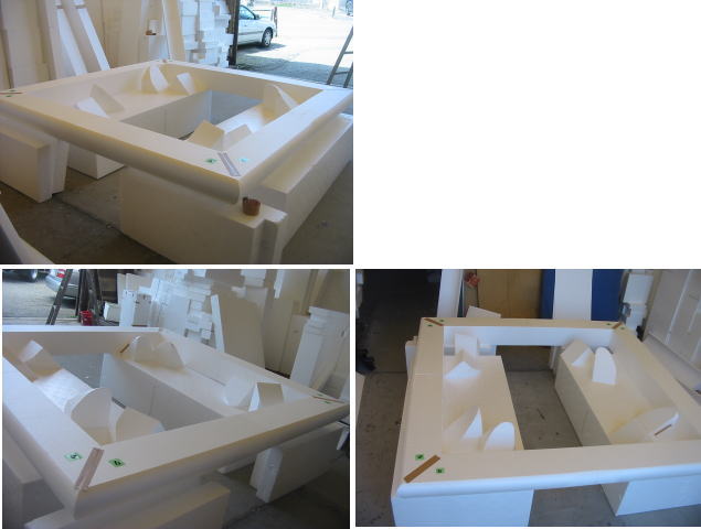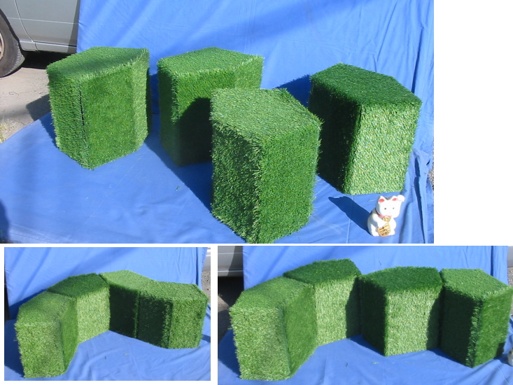 発泡スチロールブロックの五角形のかたまりに人工芝を貼っています