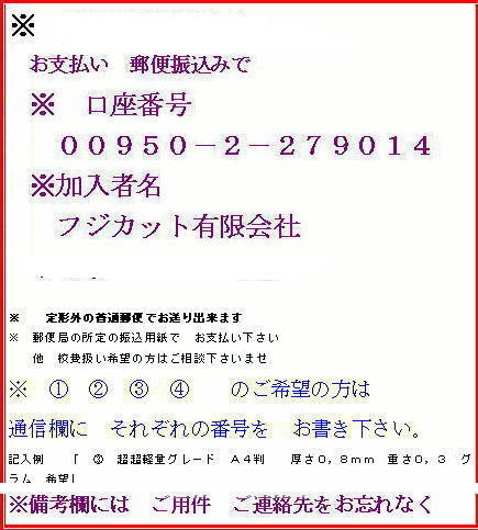 100枚 | 5380円(税込5918円) | 郵便振り込み | お急ぎの場合は振込み後 ご注文内容 ご住所などを記入の上 控えをFAXしてください ※参考ページはこちらから |